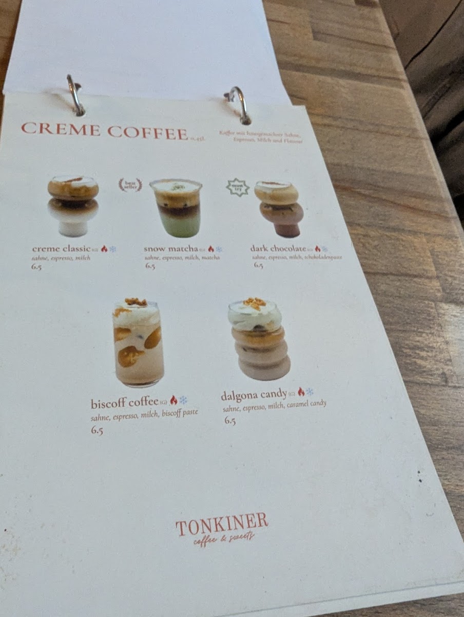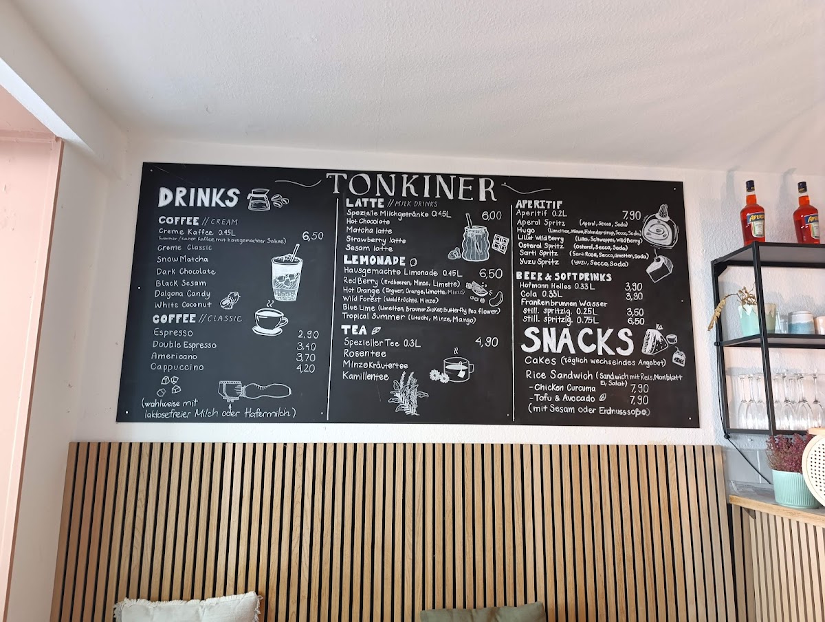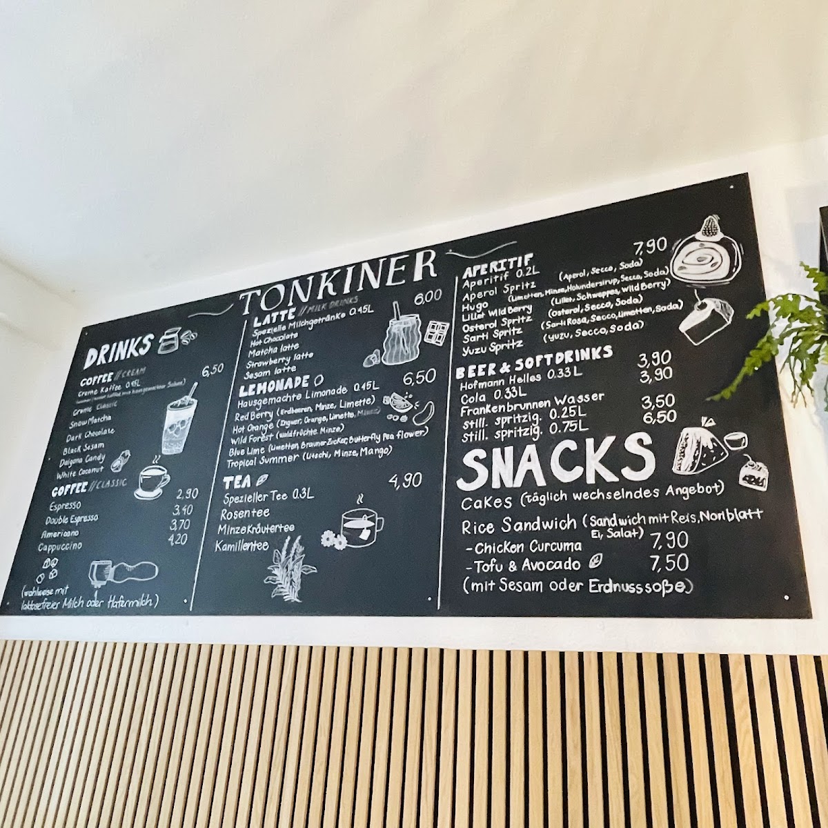 The menu at Tonkiner Cafe offers a selection of beverages and light food items suitable for various times of the day, including breakfast, coffee breaks, and light meals. The beverage options focus primarily on specialty coffee and tea-based drinks, featuring items such as matcha lattes, black sesame lattes, and coffee with coconut flavors. Cold and hot coffee variations, including cappuccino and cream coffee, are also available.