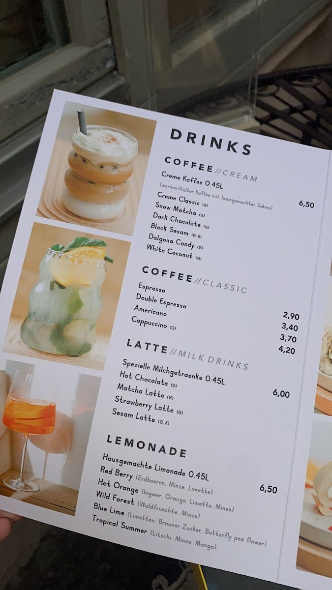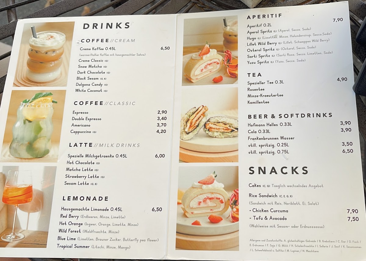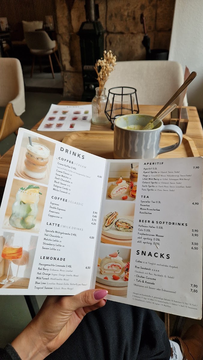 Visitors typically use the menu for casual dining and quick orders, whether stopping by for a coffee break or a light lunch. The clear structure allows selection from drinks, light savory options, and sweet treats, catering to both vegetarian and vegan preferences where indicated.