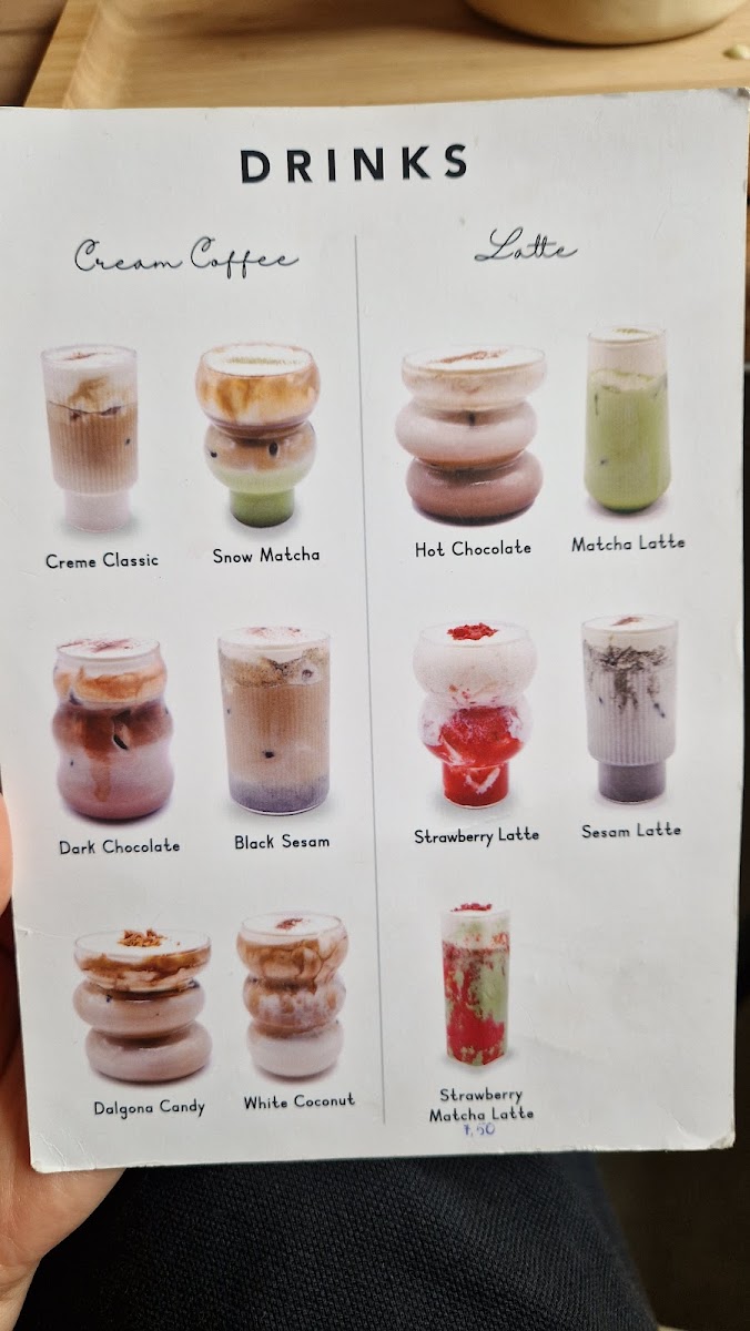 Food offerings mainly consist of light snacks and small meals that complement the drinks menu. These include rice sandwiches with fillings such as chicken, tofu, and avocado paired with sesame sauce. Additionally, the menu features a variety of baked goods and desserts, including Japanese roll cakes, cheesecake, pistachio cream rolls, banana bread, and matcha cheesecake. Some items blend traditional and contemporary elements like yuzu spritz and dalgona candy.